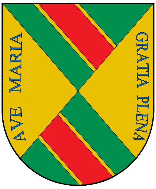 Escudo cuartelado: 1º y 4º a su vez cuartelados en aspa, primero y cuarto, de sinople, con una banda de oro cargada con una cotiza de gules, y segundo y tercero, de oro con la leyenda "AVE MARIA GRATIA PLENA" de azur