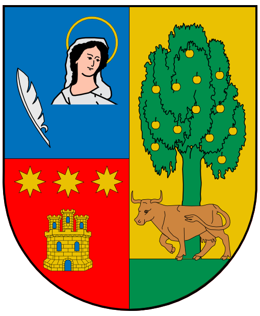 En campo de gules, dos calderas endentadas en faja de oro y sable, una sobre otra, con siete serpientes de sinople saliendo de cada lado de las asas, tres hacia dentro y cuatro hacia afuera.