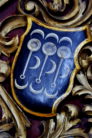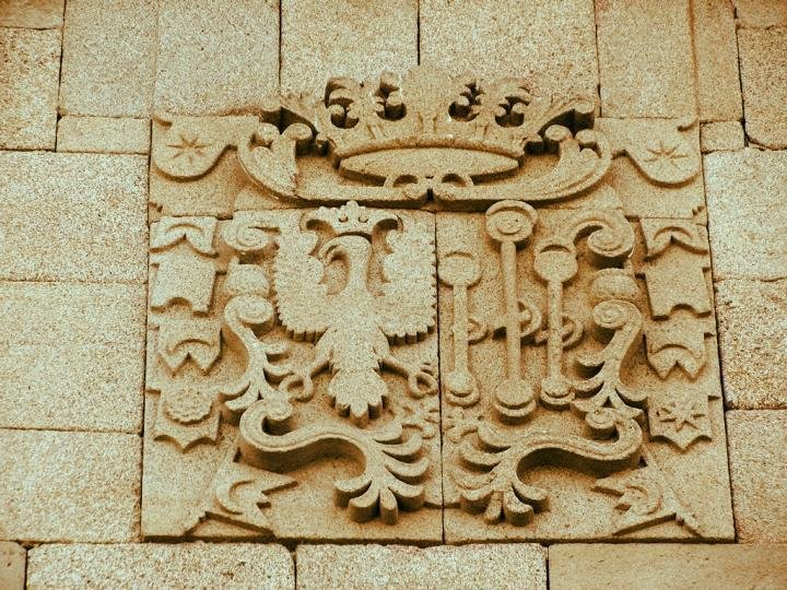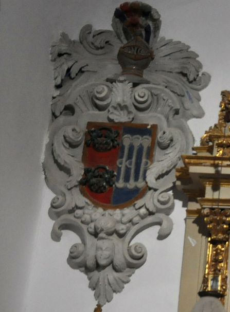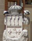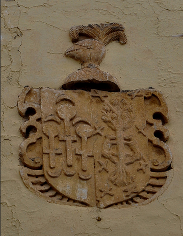 Blasón: Vemos en detalle el escudo de Dª Ana de Sande Padilla y Bobadilla. En el lado derecho (el que vemos a la izquierda) está el águila de sable (negra) propia de los Sande, con las alas abiertas, aunque no figura el cordón de San Francisco en la bordura. En la izquierda del escudo, el de los Padilla que son tres badilas puestas en palo (verticalmente). Del escudo nacen gallardetones conteniendo medias lunas y rosas, probablemente de Lancáster. Todo ello timbrado con corona de marqués, puesto que son marqueses de Valdefuentes.[1] [1-Fiestas de Valdefuentes] Por Estremadura.com. |