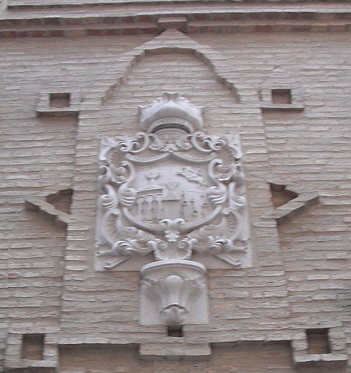 Blasón: Escudo terciado en palo: 1 1/4 medio cortado: primer cuartel de plata con león rampante de purpura, lampeado de gules; y segundo cuartel de azur, con una cruz ancorada y floreteada en el brazo derecho, de plata, con bordura dentada de gules. 2 1/4 medio cortado: primer cuartel jaquelado de nueve piezas, con cinco leoncillos rampantes de purpura, lampasados de gules en campo de plata, y cuatro castillos de oro, levantados, mazonados y aclarados de azur en campo de gules; segundo cuartel: de gules con dos calderas gringoladas puestas en palo, fajadas de plata y oro. 3 1/4 de azur con tres padillas puestas por el mango hacia abajo, perpendiculares y en situación de faja, y cada una tres medias lunas de plata en lo alto, en lo bajo y en el mango.[1] [1-El Linaje de Los Peralta en Siglos XV y XVI. {12 Padillas}] Por María José y Blanca Sagasti Lacalle [2-Castillo Palacio de la Marcilla] Por Wikipedia |