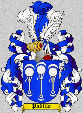 Blasón: Tres Padillas de plata en campo azul y en torno de ellas nueve medias Lunas de plata como se ven en este Escudo. |