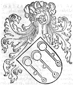 Blasón: Tres padillas de plata en campo azul con nueve lunas de plata, en cada padilla tres, como van aquí estampadas. |