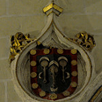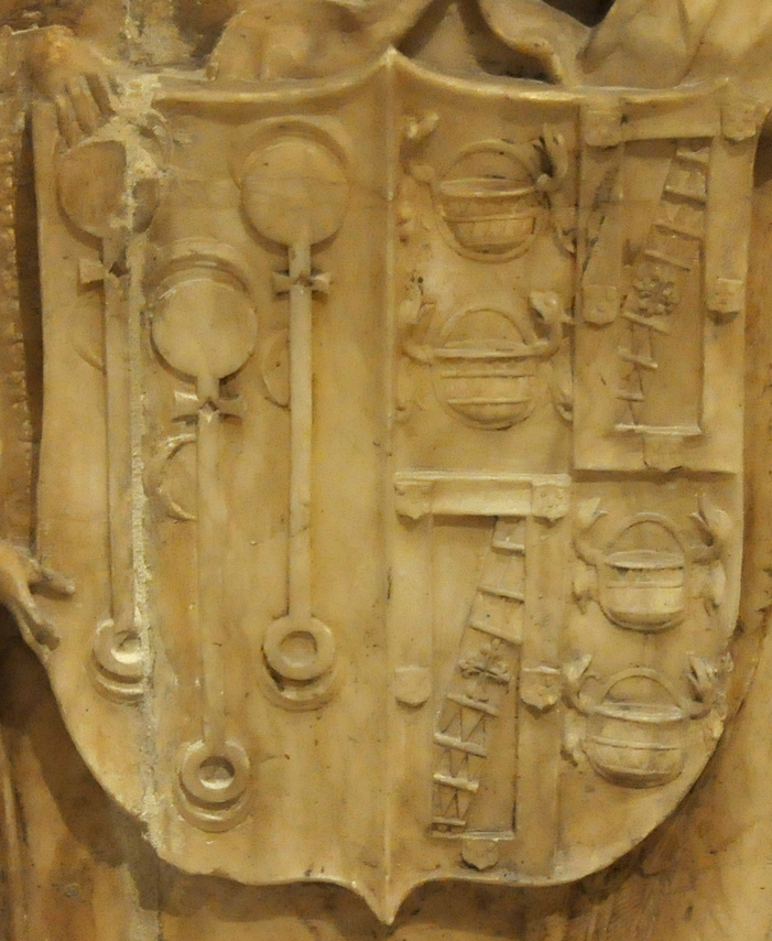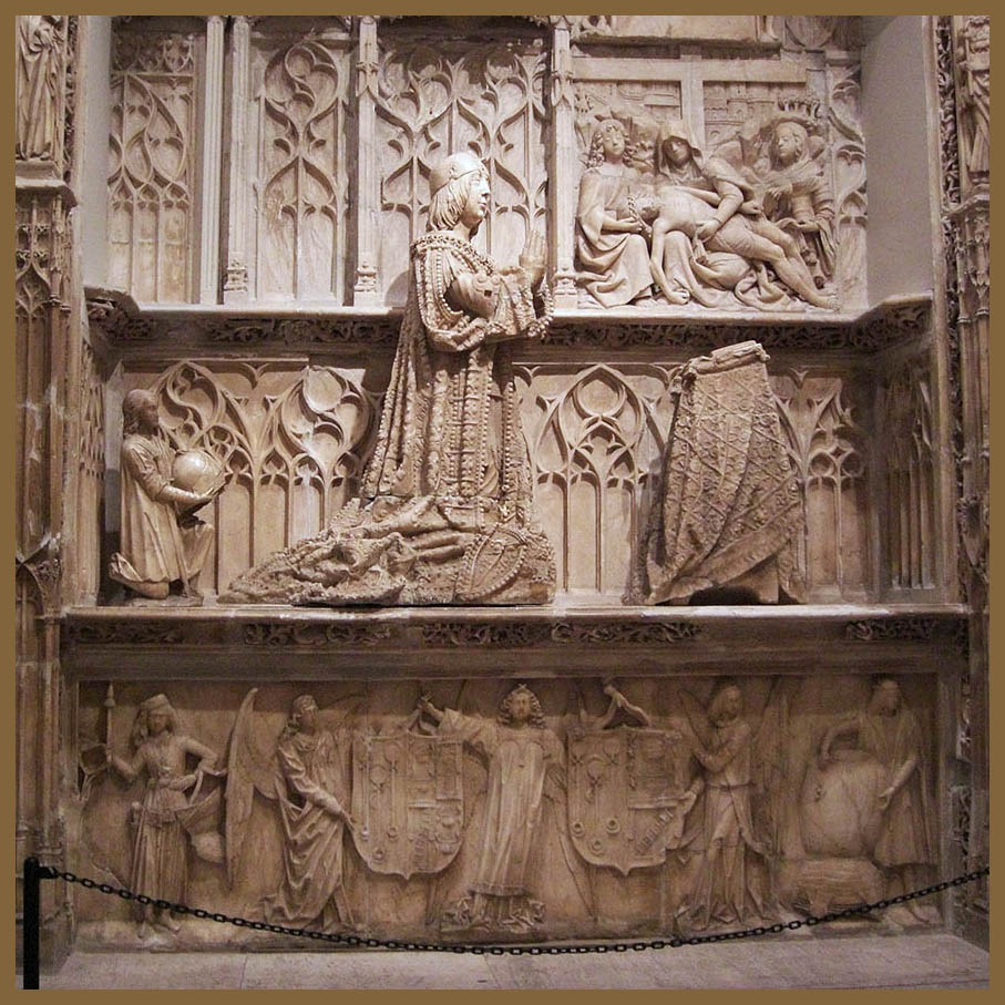 Escudo de Juan de Padilla y Pacheco ~ 1493. En el museo de Burgos en el sepulcro de Don Juan de Padilla, Doncel de la Reina Isabel. Don Juan de Padilla era el paje predilecto de Isabel la Católica, muerto en plena juventud en 1491, a los 20 años, durante una campaña de la guerra por la conquista de Granada. Tras su muerte, la reina quiso honrar su memoria encargando a Gil de Siloé un suntuoso sepulcro equiparable al que encargara para su propio hermano el infante Alfonso de Castilla en la Cartuja. Hoy aparece preservado, fuera de contexto, como una de las piezas más emblemáticas del Museo de Burgos, procede de la iglesia del arruinado monasterio de Nuestra Señora de Fresdelval y a la que faltan siete esculturas que decoraban la parte superior, actualmente repartidas por museos del mundo, tres de ellas en el Museum of Fine Arts de Boston, dos en el Metropolitan Museum de Nueva York y otras dos en colecciones privadas. El escultor Gil de Siloé, representa la cumbre alcanzada por la escultura hispánica a finales del siglo XV.[1] [1-Domus Pucelae:Sepulcro de Don Juan de Padilla y Pacheco] Por http://domuspucelae.blogspot.com/ [2-Gil de Siloe] Por Wikipedia. |