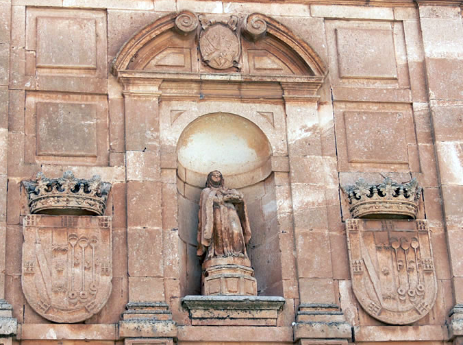 Las raíces de este célebre monasterio se remontan al año 1251. Según una tradición popular, durante la invasión musulmana, unos fieles de la zona escondieron bajo tierra unas imágenes para preservarlas de la destrucción. Años más tarde fueron halladas estas esculturas: San Ildefonso, San Andrés y la Virgen del Espino. A esta última talla se le atribuyeron ciertos milagros en la época por lo que se decidió venerarla en un lugar apropiado. Así se erigió una ermita, sobre la que tiempo después se levantó el monasterio actual, fundado por el Adelantado Mayor de Castilla Pedro López de Padilla y su esposa Isabel de Pacheco en 1477... En el convento estuvo, durante un tiempo, el manuscrito original del Cantar del Mío Cid. Actualmente es un monasterio de la Orden de los Benedictinos. El monasterio fue declarado BIC (Bien de Interés Cultural) el 31 de octubre de 1991.[1] Blasón: Escudo partido. Primero en plata, cinco escudetes de azur, puestos en cruz, cargados cada uno de cinco bezantes de plata. Segundo en azur, tres padillas de plata puestas con el mango hacia abajo y en situación de faja, acompañadas cada una de tres medias lunas del mismo metal, puestas en lo alto en lo bajo y al centro del costado de cada padilla. Con bordura de gules cargada de siete castillos de oro, tres en jefe, dos en flanco y dos hacia la punta [1-Burgos Mágico - Vivar del Cid] Por http://burgosmagico.blogspot.com/ [2-Escudos : Fotos] Por http://arteconhistoriaescudos.blogspot.com/ [3-Monasterio de Nuestra Señora del Espino (Vivar del Cid)] Por Wikipedia. |
